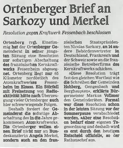 Schaden kommen und große Gebiete für lange Zeit unbewohnbar werden. Ortenberg liegt nur ca. 75 km nordöstlich und in der Hauptwindrichtung des Atomkraftwerkes Fessenheim/Elsass. |